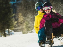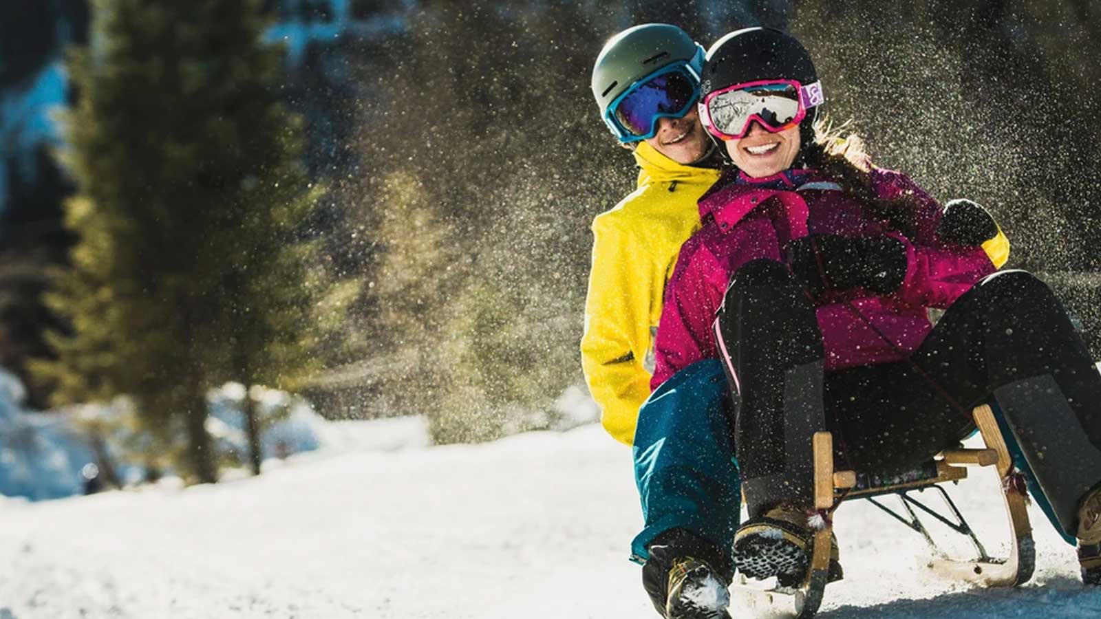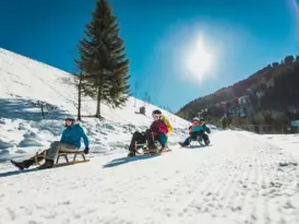 Rodeln in winterlicher Landschaft macht nicht nur den Kindern Spaß, auch die Erwachsenen fühlen sich zurückversetzt in ihre Kindheit.